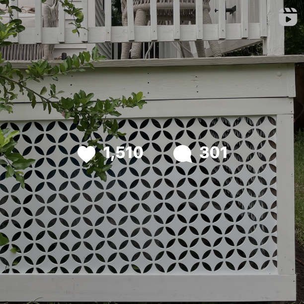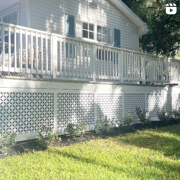 “I’ve been tolerating looking at the underside of my deck for almost a decade. 🙈 It bugged me every time I went into the backyard. I started searching for ways to pretty it up and voila, the gorgeous options from @acuriolatticeworks appeared. This skirting literally makes me so happy! The quality is awesome, it’s vinyl so yeah, maintenance free and the adorable floral motif adds the perfect amount of cottage charm. What’s not to love?”
