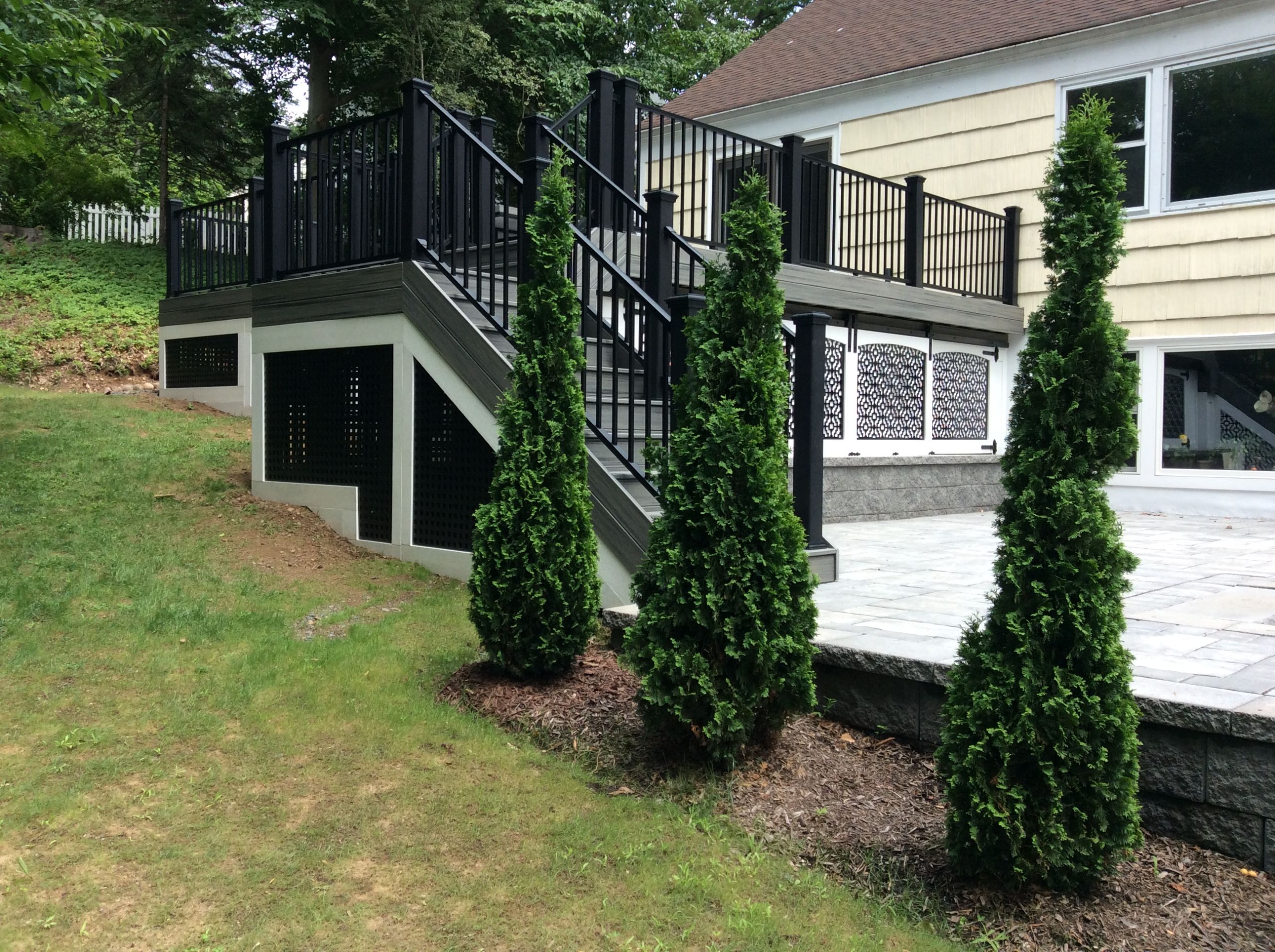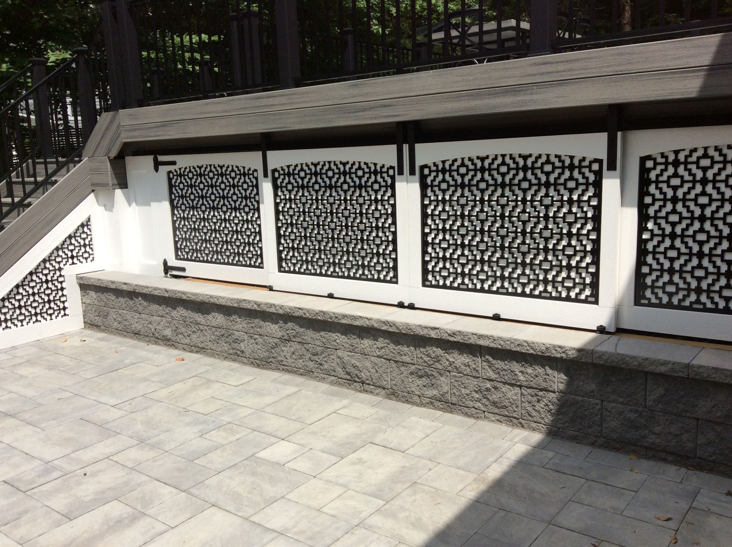 This beautiful elevated deck installed by Fazio Home & Land Company in Whitehouse Station, NJ features Acurio Lattice as a decorative accent that closes off space under the deck.