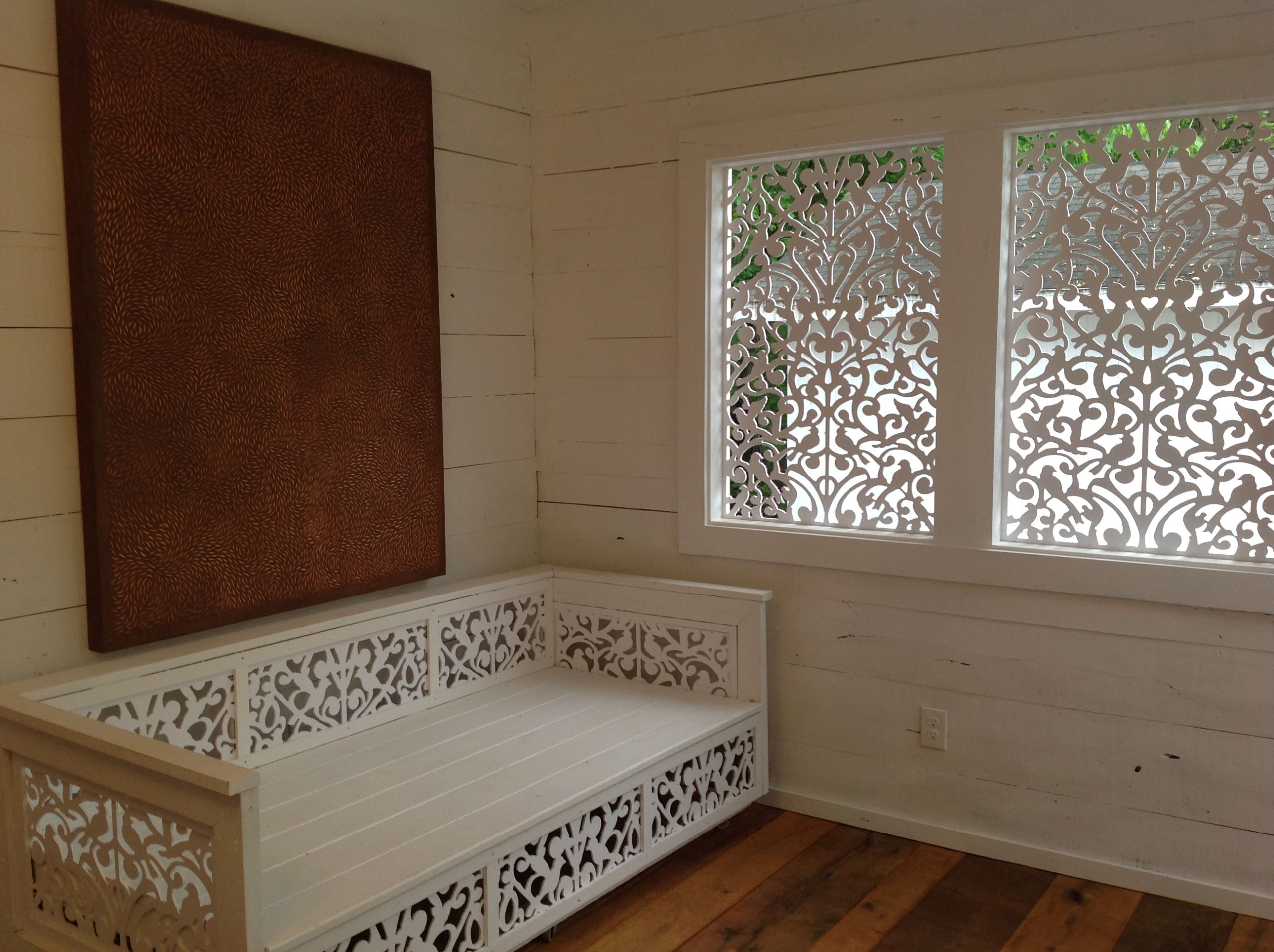 This cottage featuring Acurio Lattice throughout is actually a lounge area and local art gallery for a wedding event space in Mebane, NC. Acurio was selected to create a comfortable, semi-private space with fresh air and plenty of wedding day whimsy.